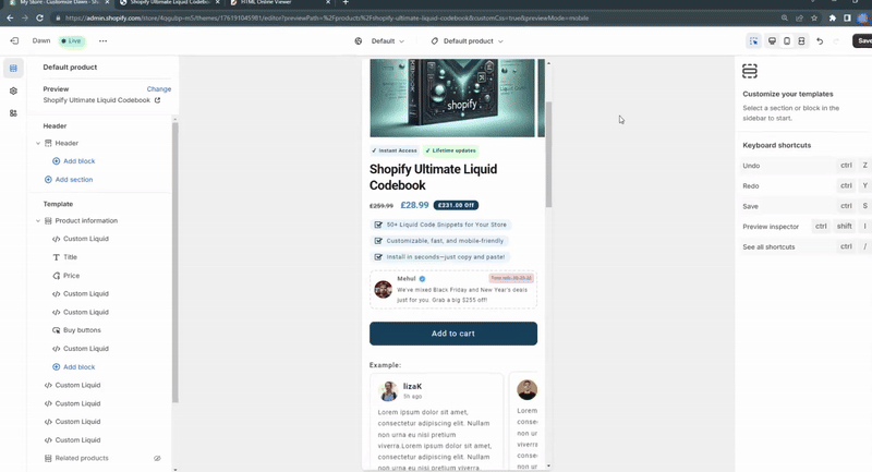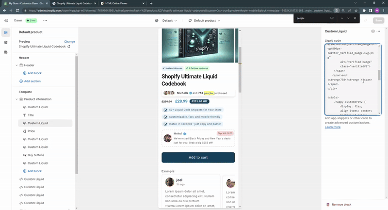 Simply go to your editor and add a Custom Liquid block to add new features You will see improvements instantly!