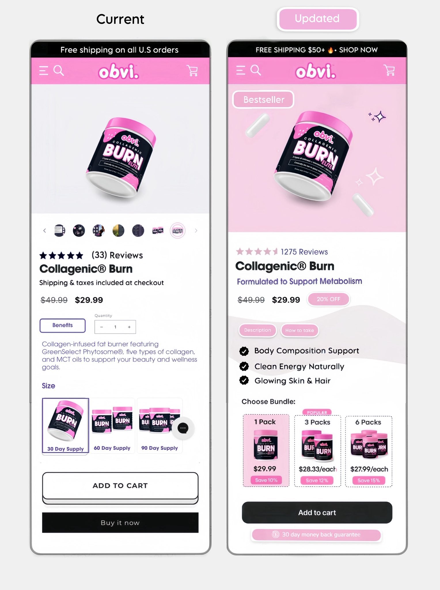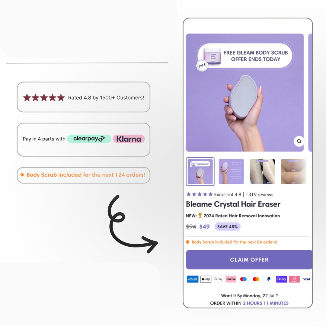 With the Codebook, you unlock 60+ conversion-focused sections that instantly transform your store into the version on the right: trust badges, reviews, urgency bars, clean design.
